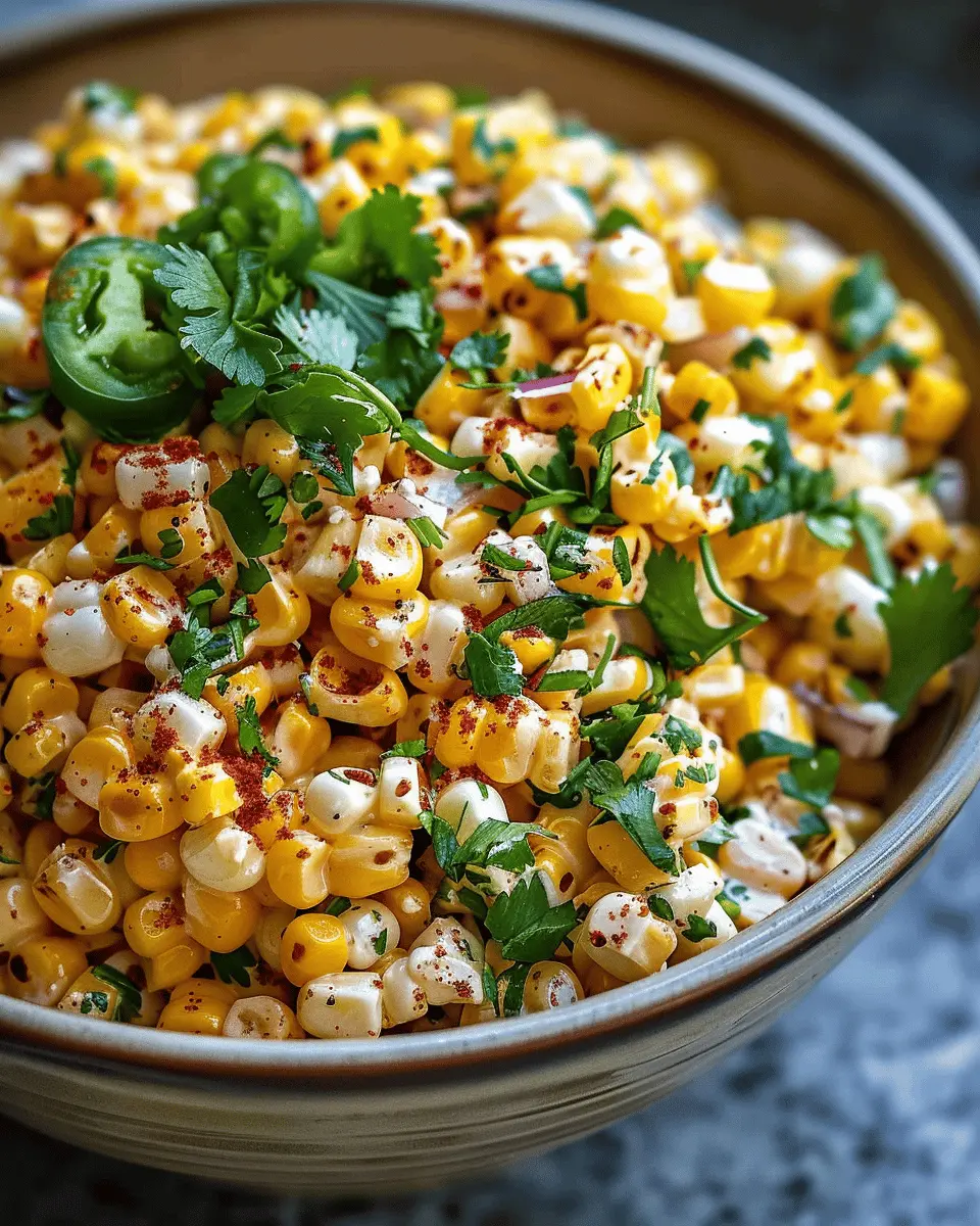 This salad is typically made using fresh corn (grilled or roasted for that authentic smoky taste), mixed with a sprinkle of chili powder, tangy mayonnaise or Greek yogurt, and finished with crumbled cheese and cilantro. The result? A colorful and refreshing medley that promises to be a crowd-pleaser at gatherings or a satisfying solo lunch!