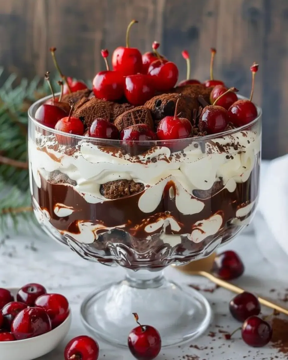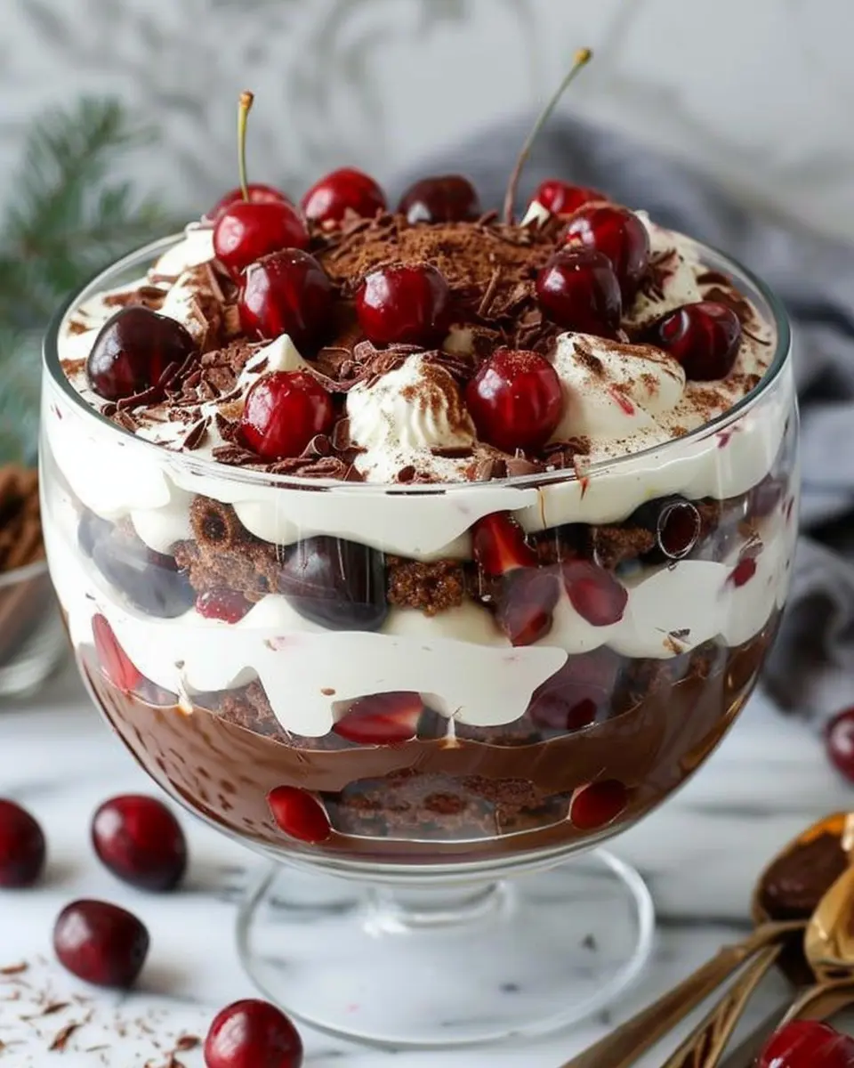 To enhance the flavors of your Black Forest Trifle, think about serving it alongside a selection of beverages. A rich cup of coffee or a light herbal tea complements the dessert beautifully and balances the sweetness. For a fun twist, offer sparkling water infused with fresh lemon or mint to cleanse the palate.