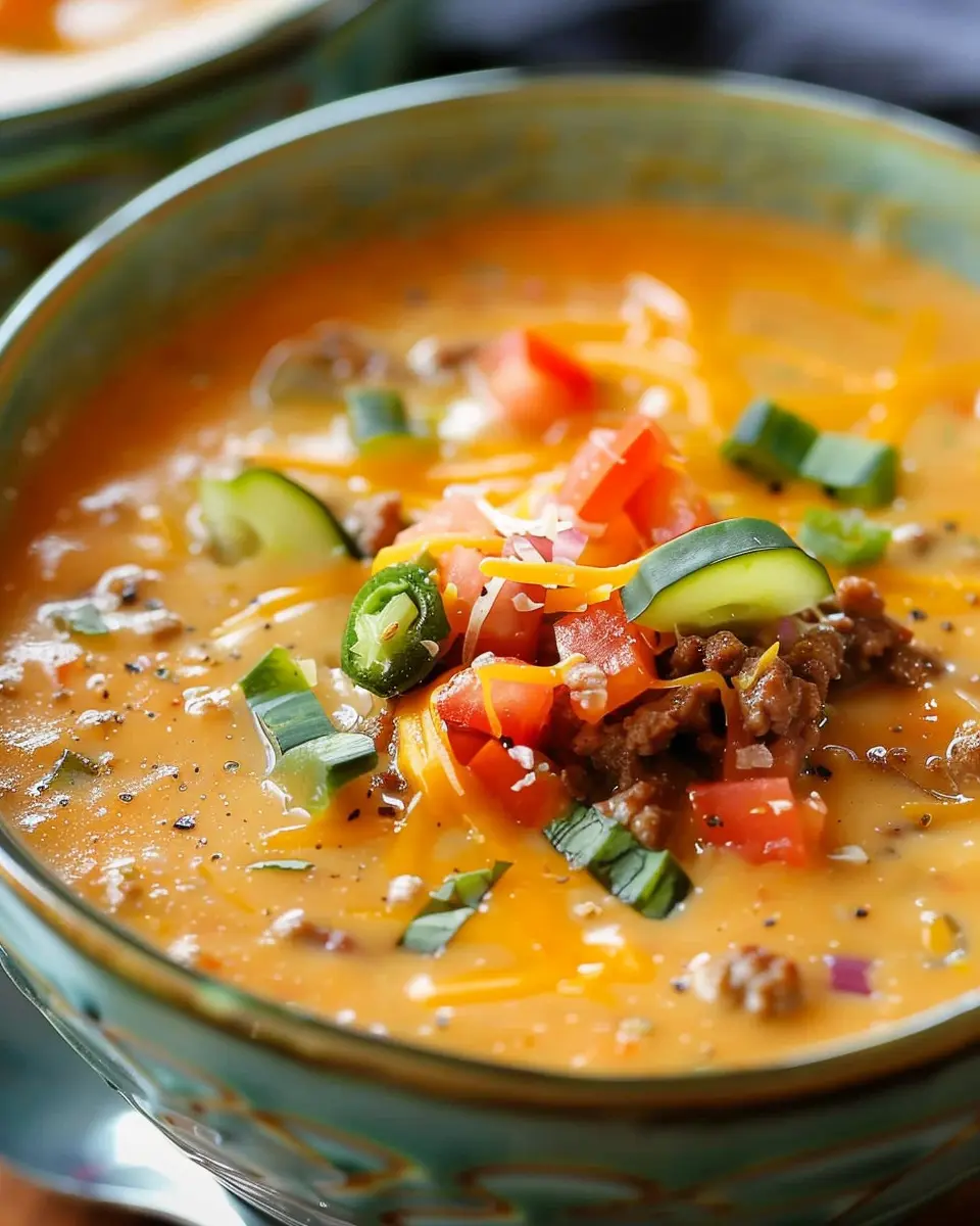 Enjoy a creamy and flavorful twist on a classic cheeseburger with this easy-to-make Cheeseburger Soup featuring turkey bacon.