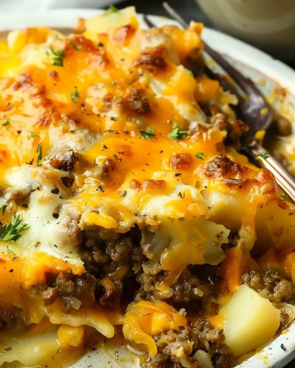 PrintCheesy Ground Beef and Potato Casserole: Easy Comfort Food Delight