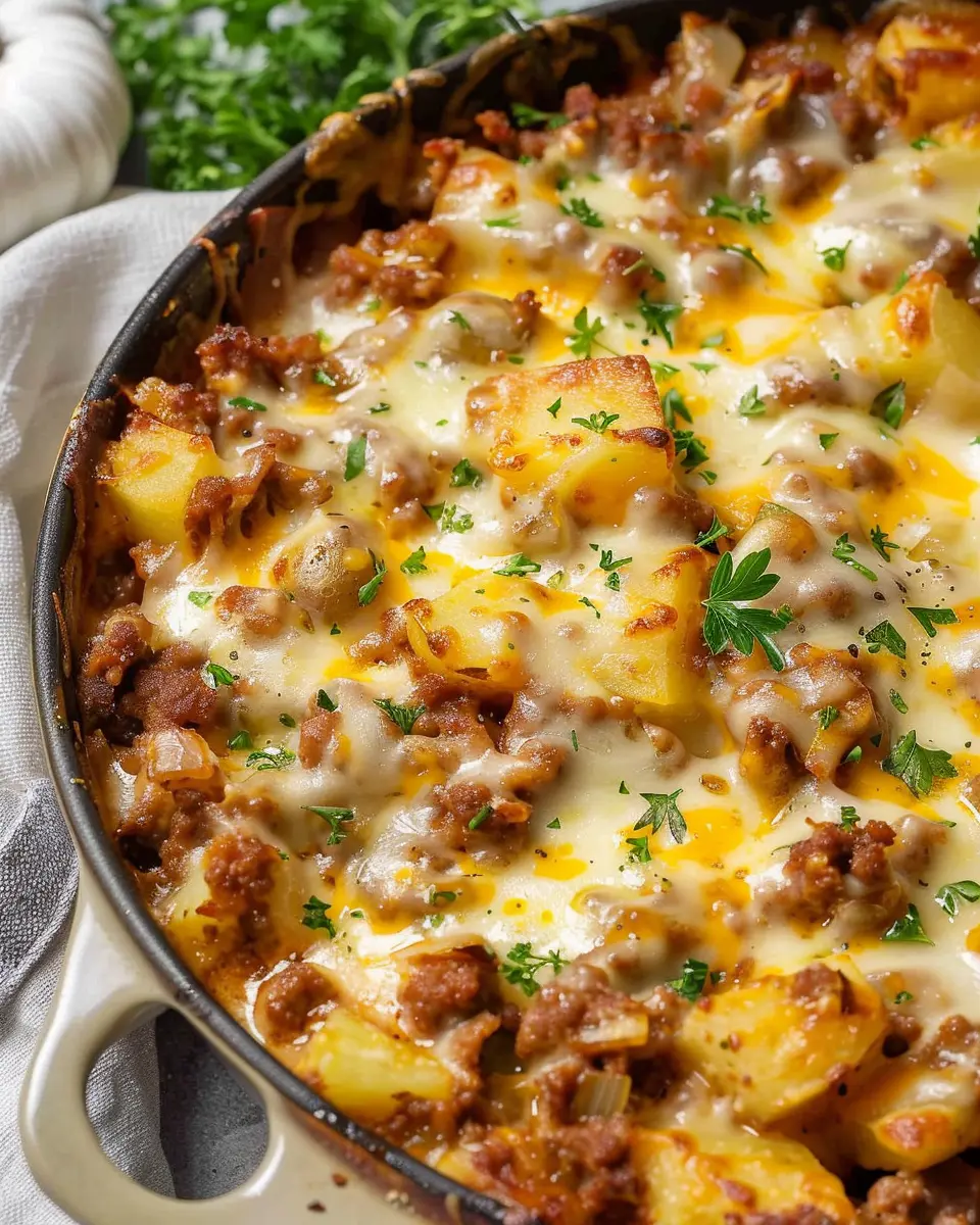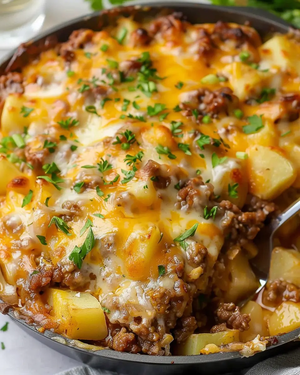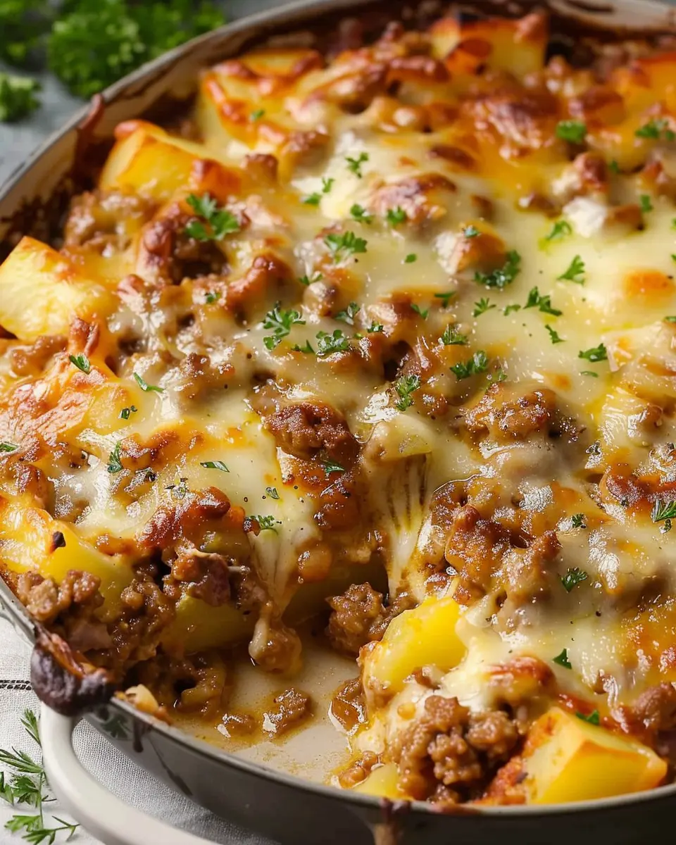 Indulge in this Cheesy Ground Beef & Potato Casserol, a delightful comfort food that combines savory beef, cheesy goodness, and tender potatoes for a satisfying meal.