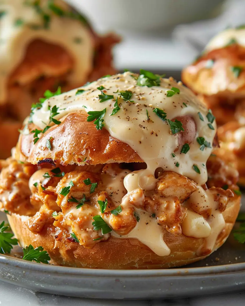 Finally, it’s time for the fun part: assembly! Generously spoon the Chicken Alfredo mixture onto the bottom half of each toasted brioche bun. Top with a sprinkle of fresh parsley for that pop of color and added flavor.