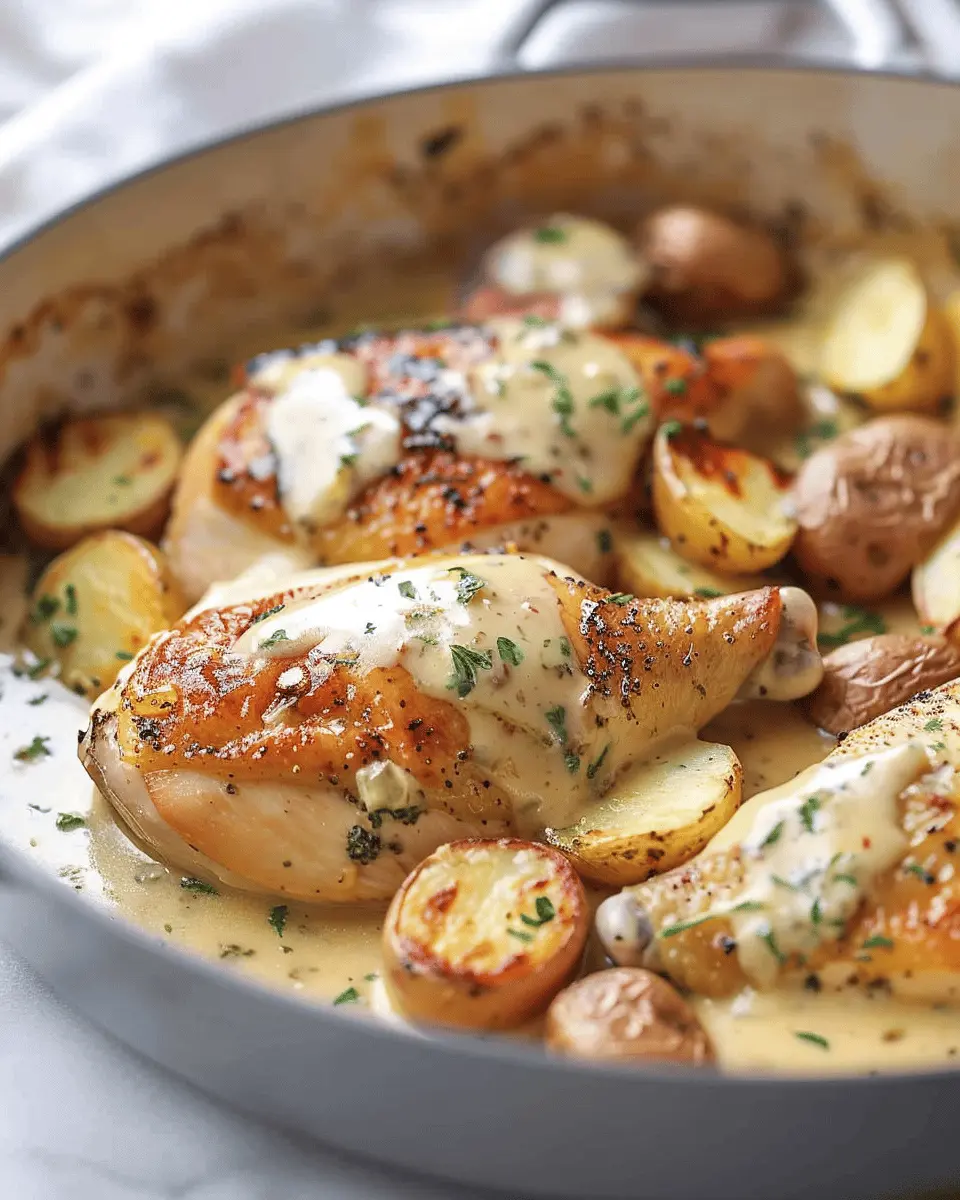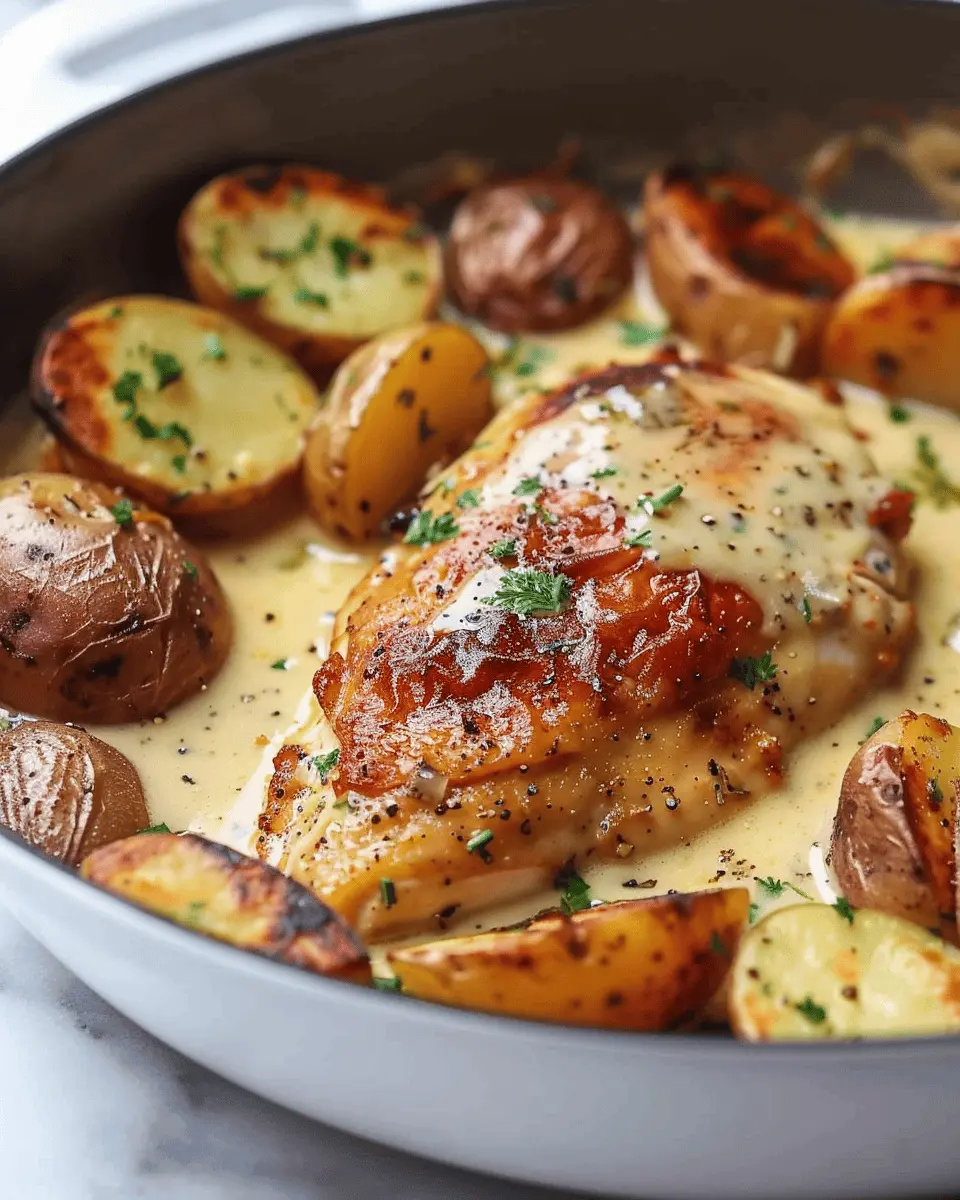 Assemble in the Skillet: Pour the Dijon cream sauce over the seared chicken and potatoes. Ensure everything is nicely coated.