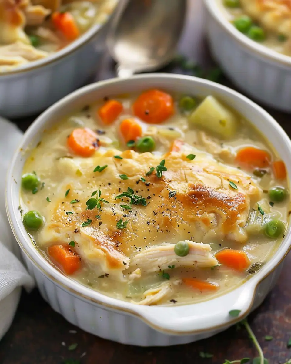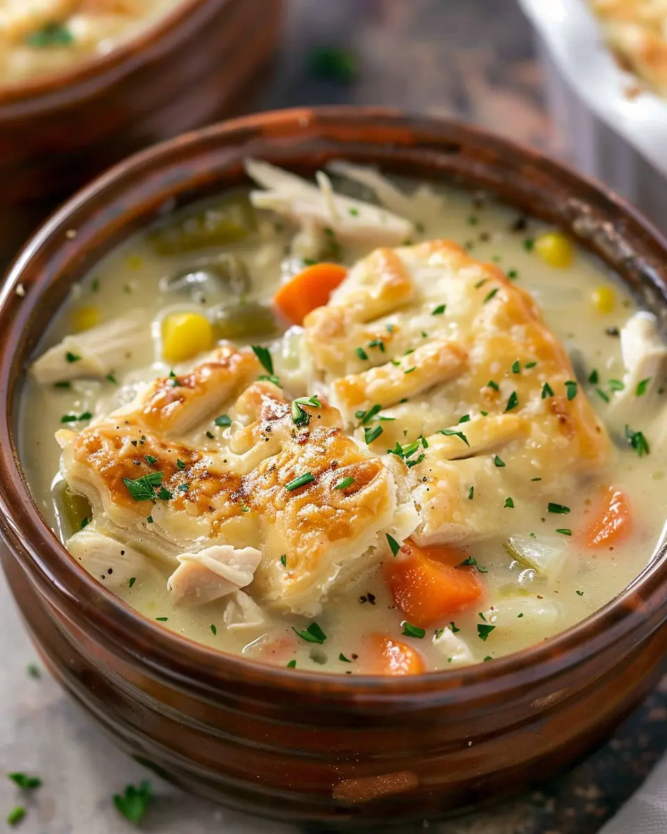 A warm and comforting chicken pot pie soup that captures all the flavors of the classic dish.
