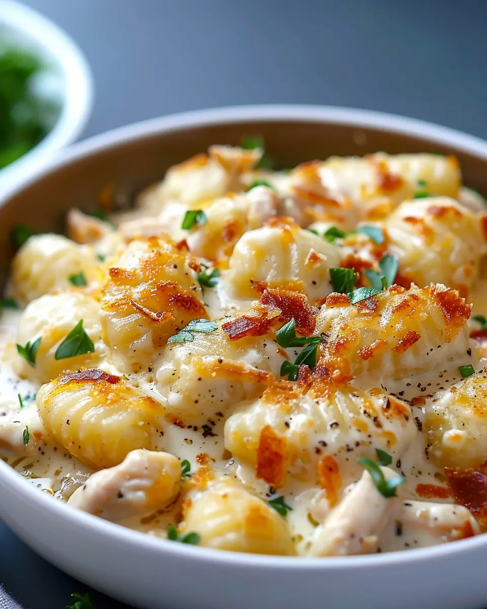Keywords: Creamy Crack Chicken Gnocchi, comfort food, turkey bacon