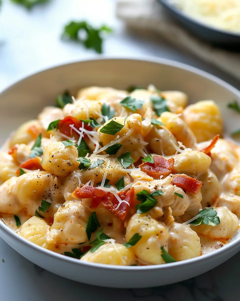 A rich and creamy dish combining chicken and gnocchi with the savory flavor of turkey bacon.