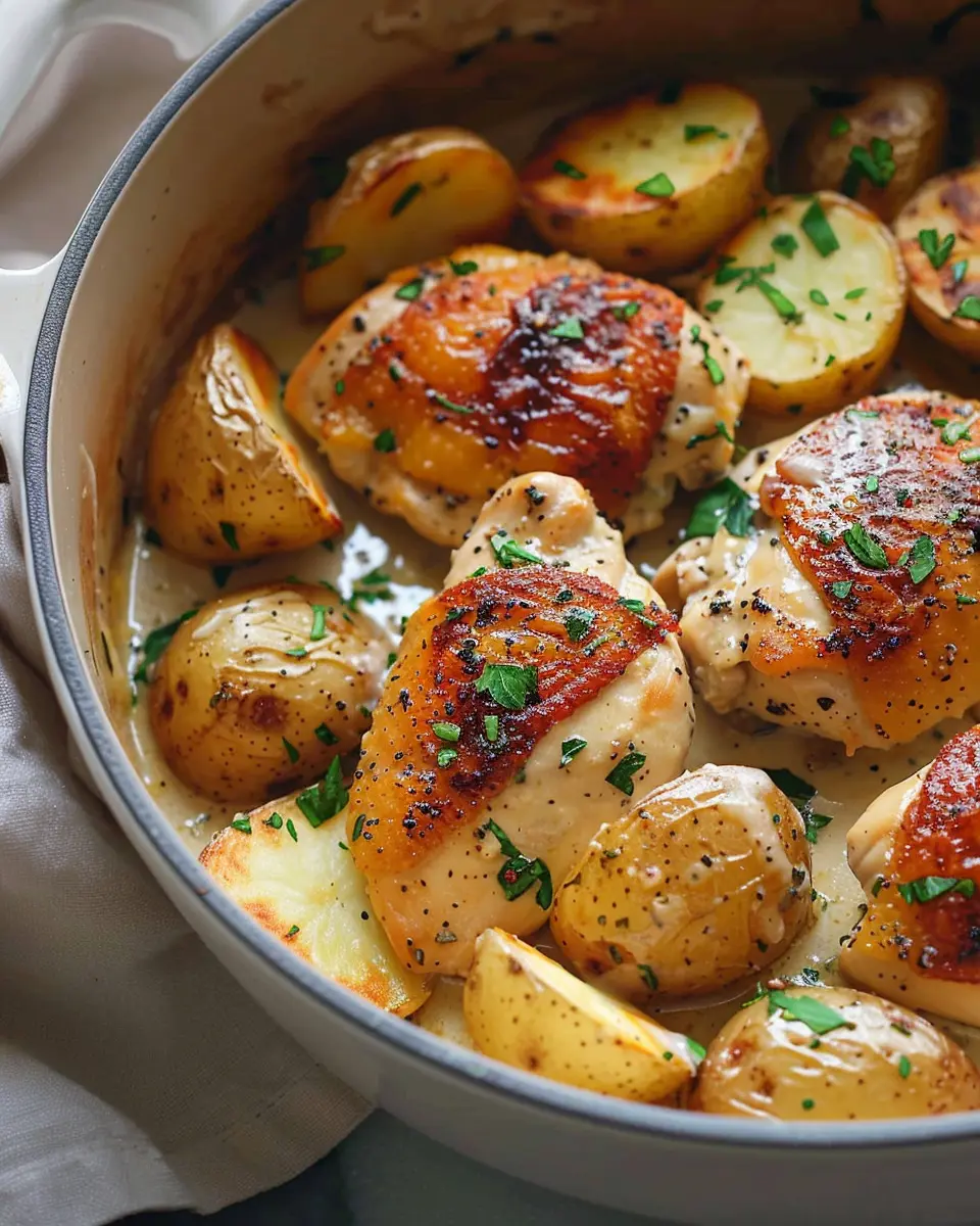 Once everything’s prepped, the cooking will take around 35-40 minutes. You’ll be rewarded with tender chicken and perfectly roasted potatoes that soak up all that creamy goodness.