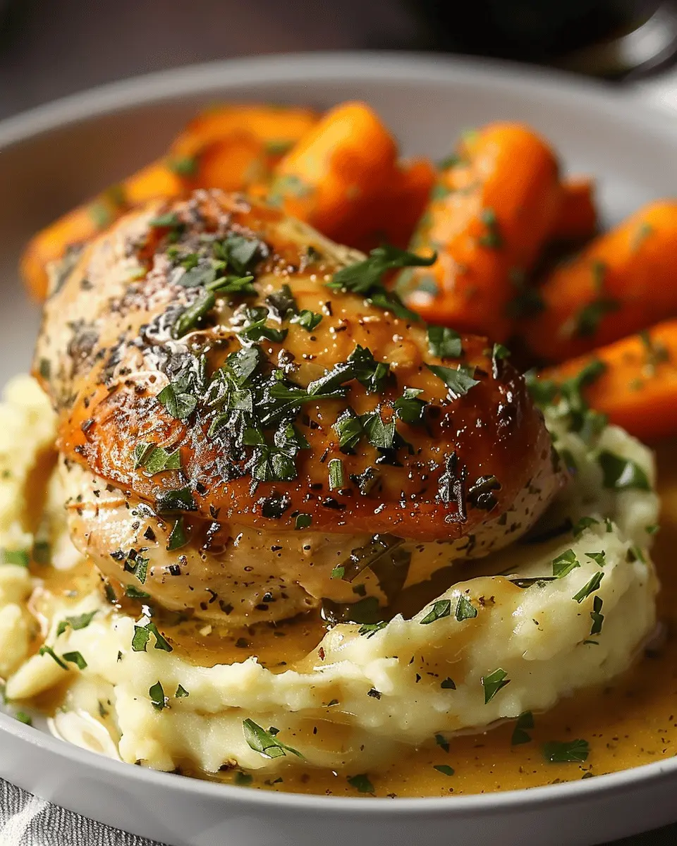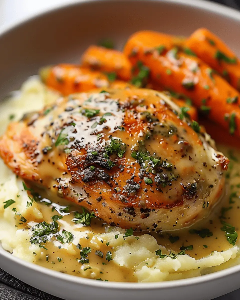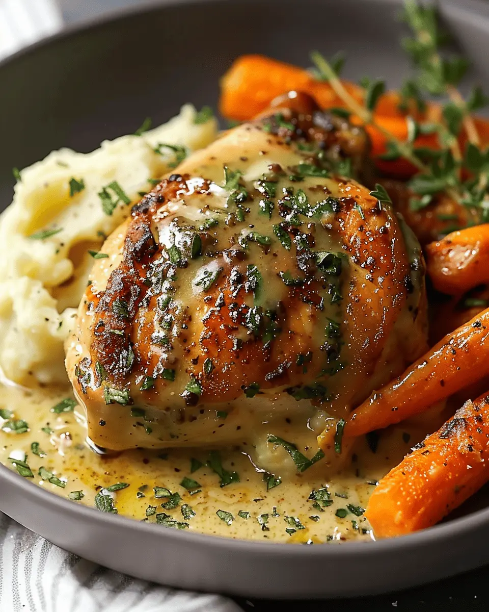 PrintCreamy Herb Chicken: Easy Recipe with Mashed Potatoes & Glazed Carrots