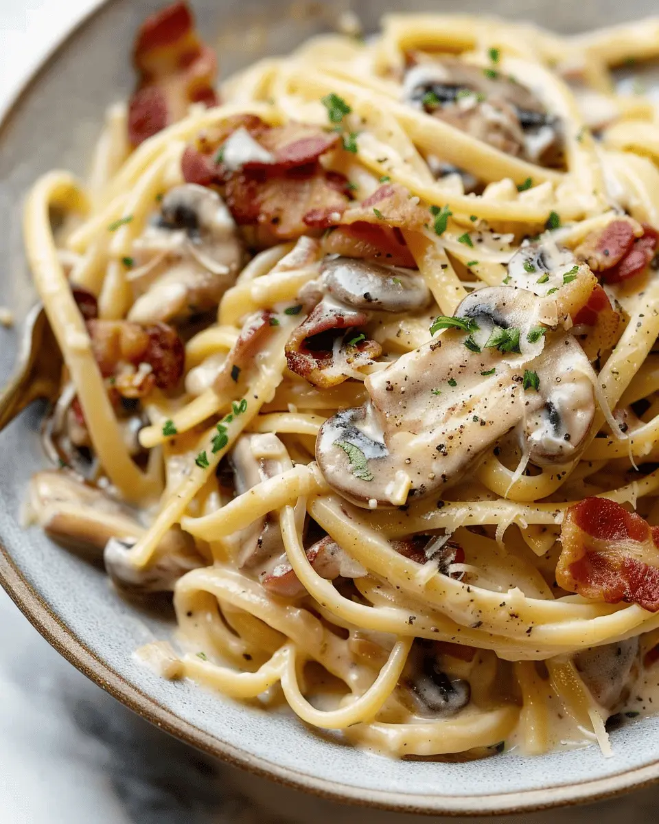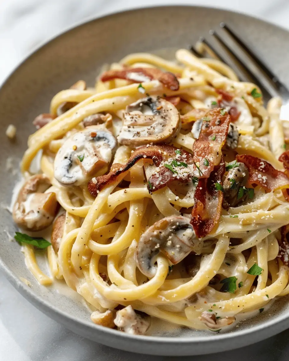 Keywords: Creamy Bacon and Mushroom Pasta, Turkey Bacon Pasta, Comfort Food