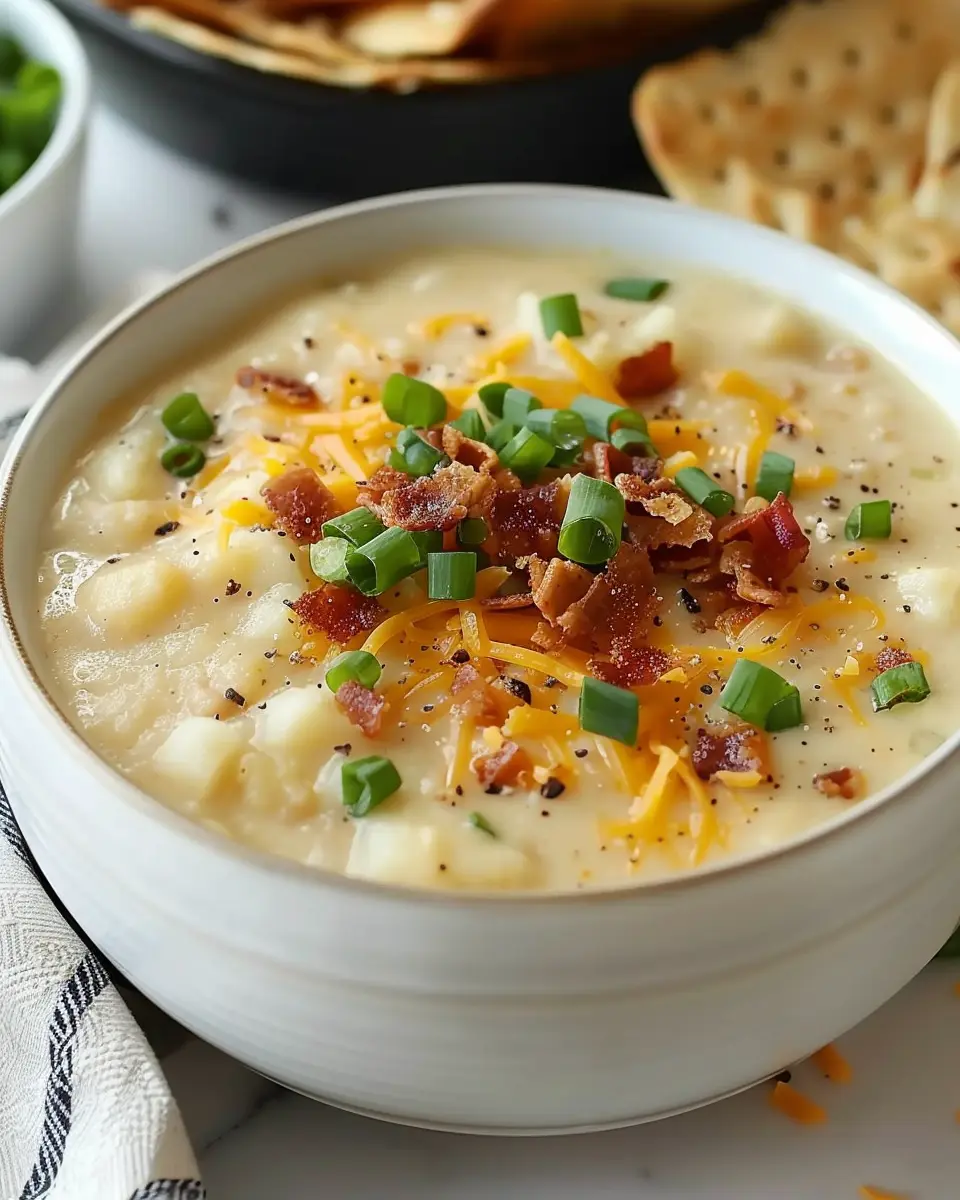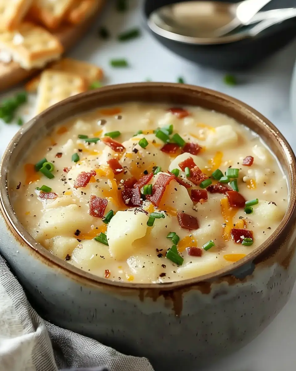A creamy and indulgent potato soup made in the Crock Pot, perfect for chilly evenings.