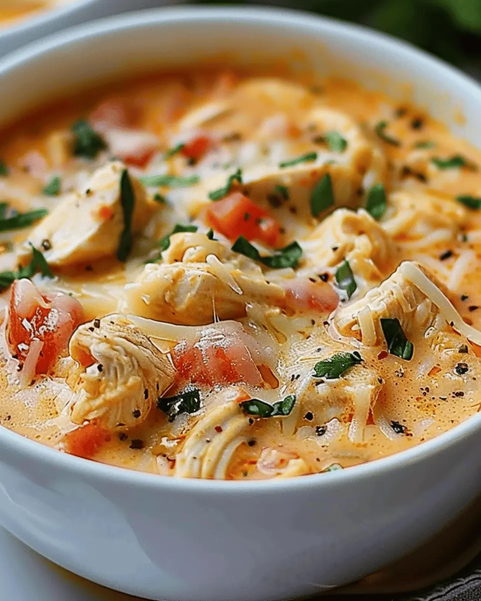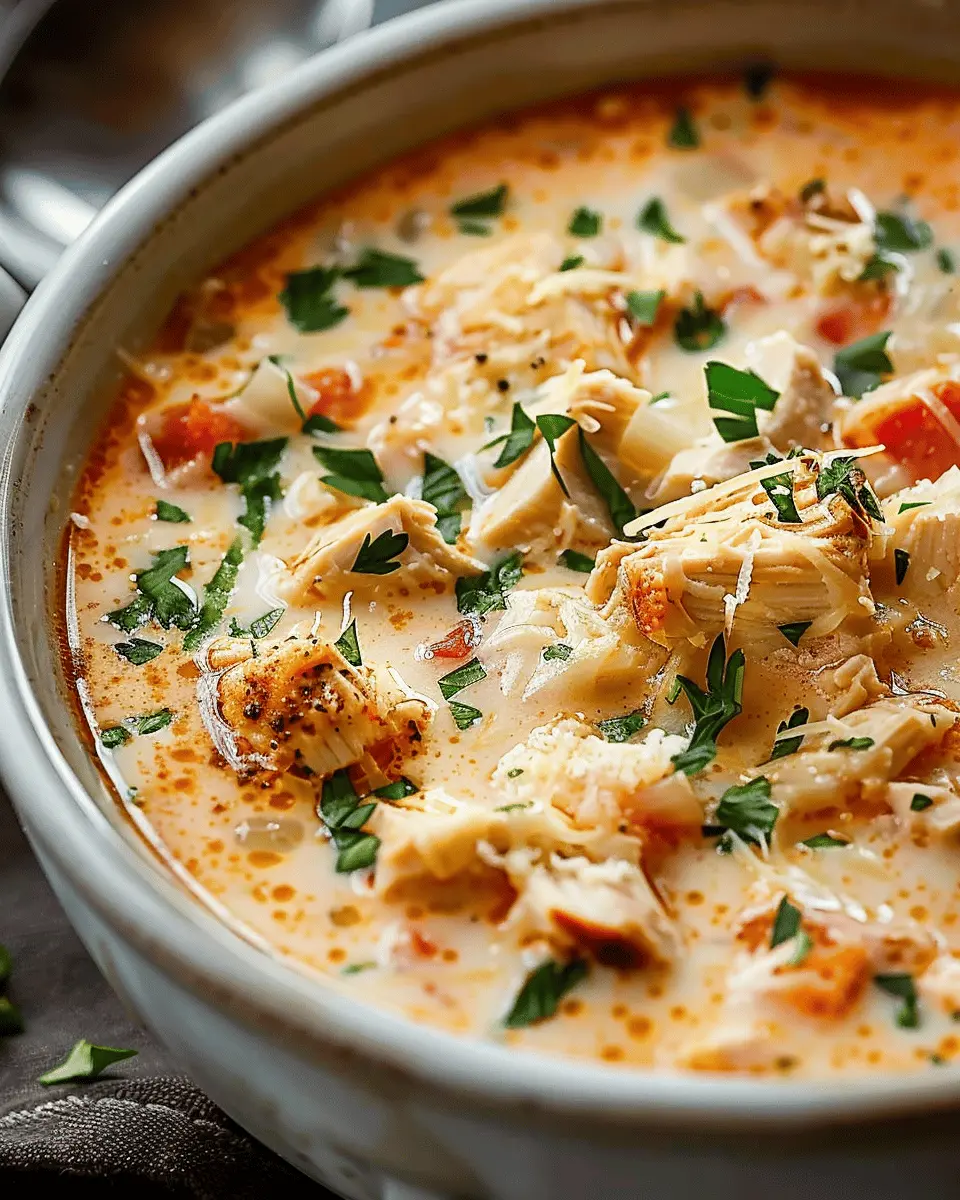 A rich and creamy chicken soup with a hint of parmesan cheese, perfect for a cozy dinner.
