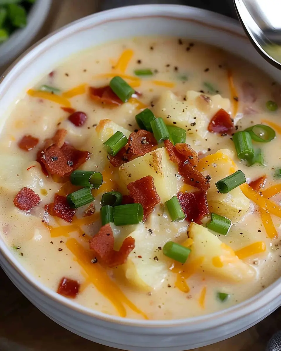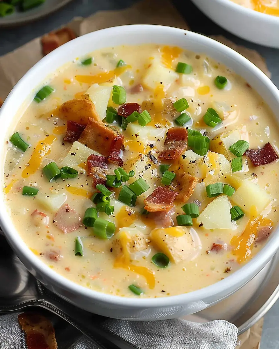 A creamy and flavorful potato soup made effortlessly in a crock pot, enhanced with turkey bacon and chicken ham for a comforting meal.