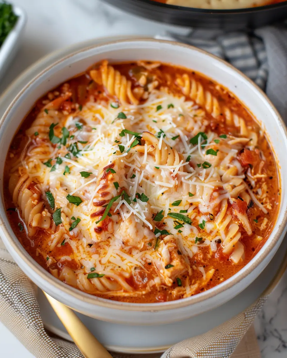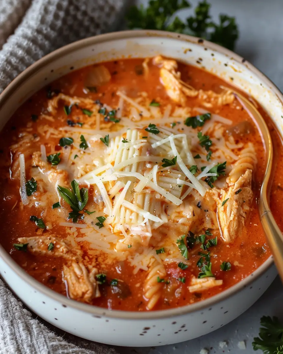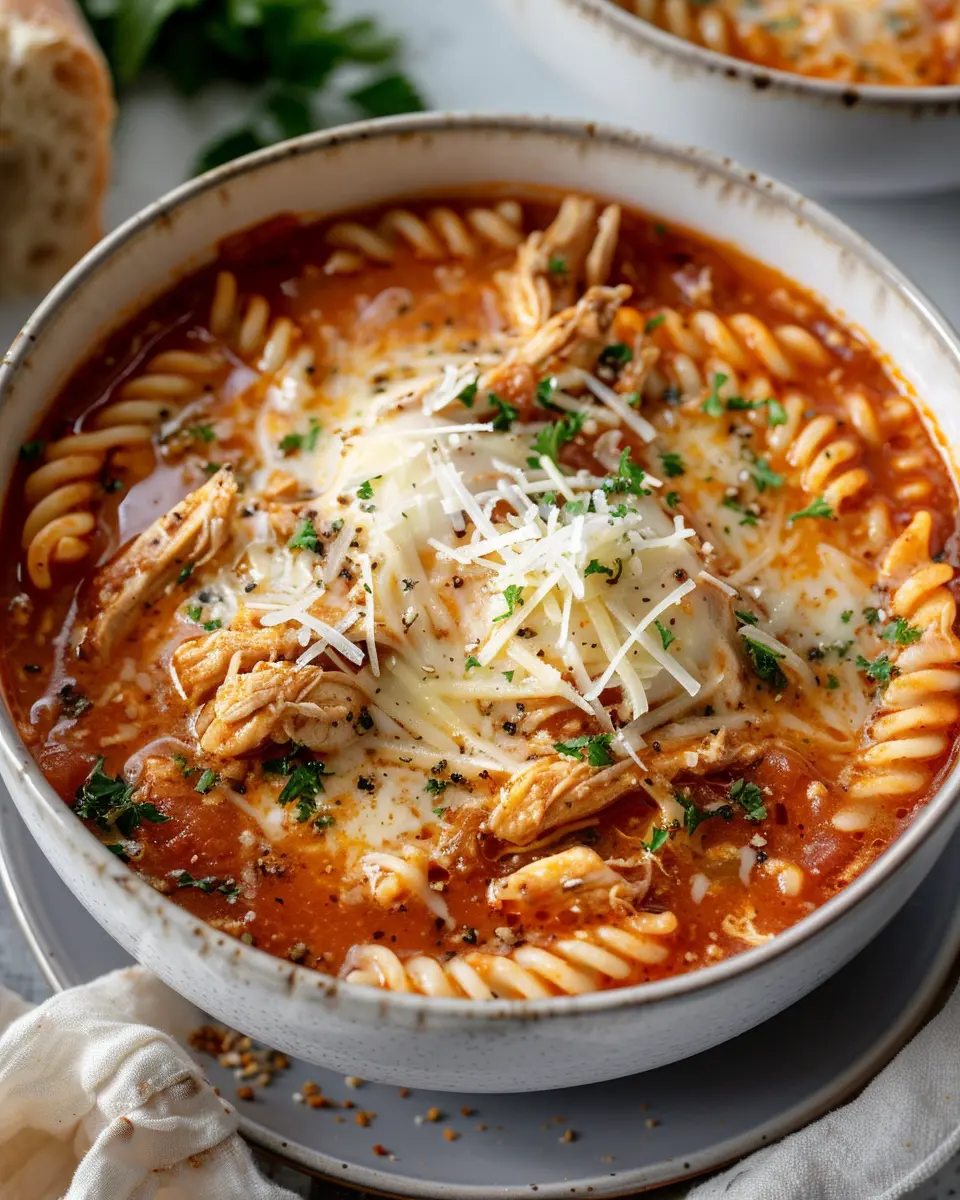 A delicious, easy-to-make crockpot soup that combines the comforting tastes of chicken parmesan in a hearty, warm dish.