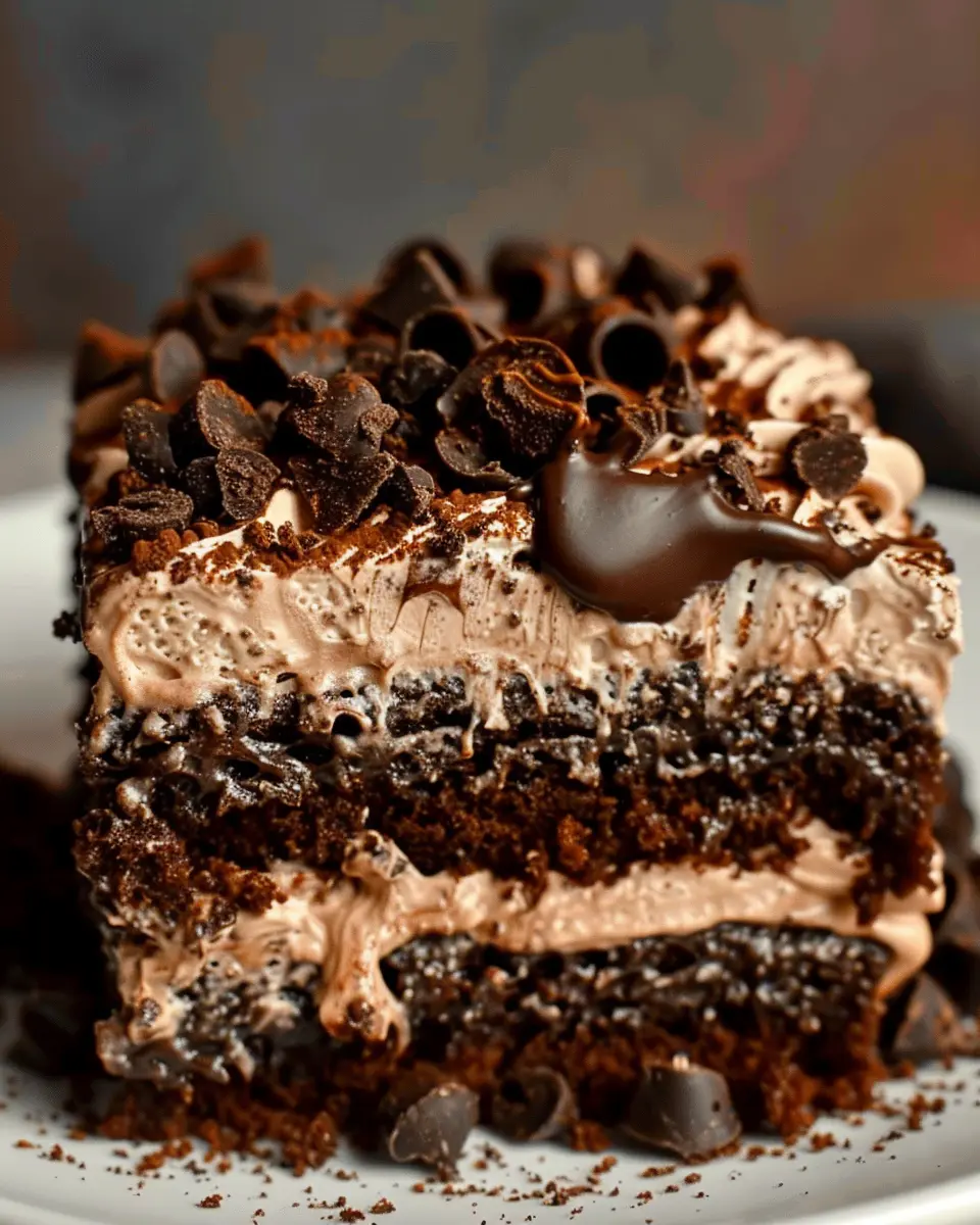 - Layer the Cakes: On a serving platter, place one of the cooled chocolate cakes. Pour half of the hot fudge layer over it, allowing it to sink in for extra chocolaty goodness.