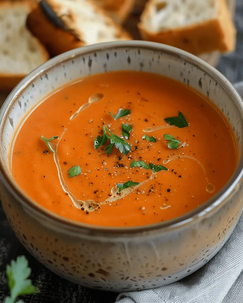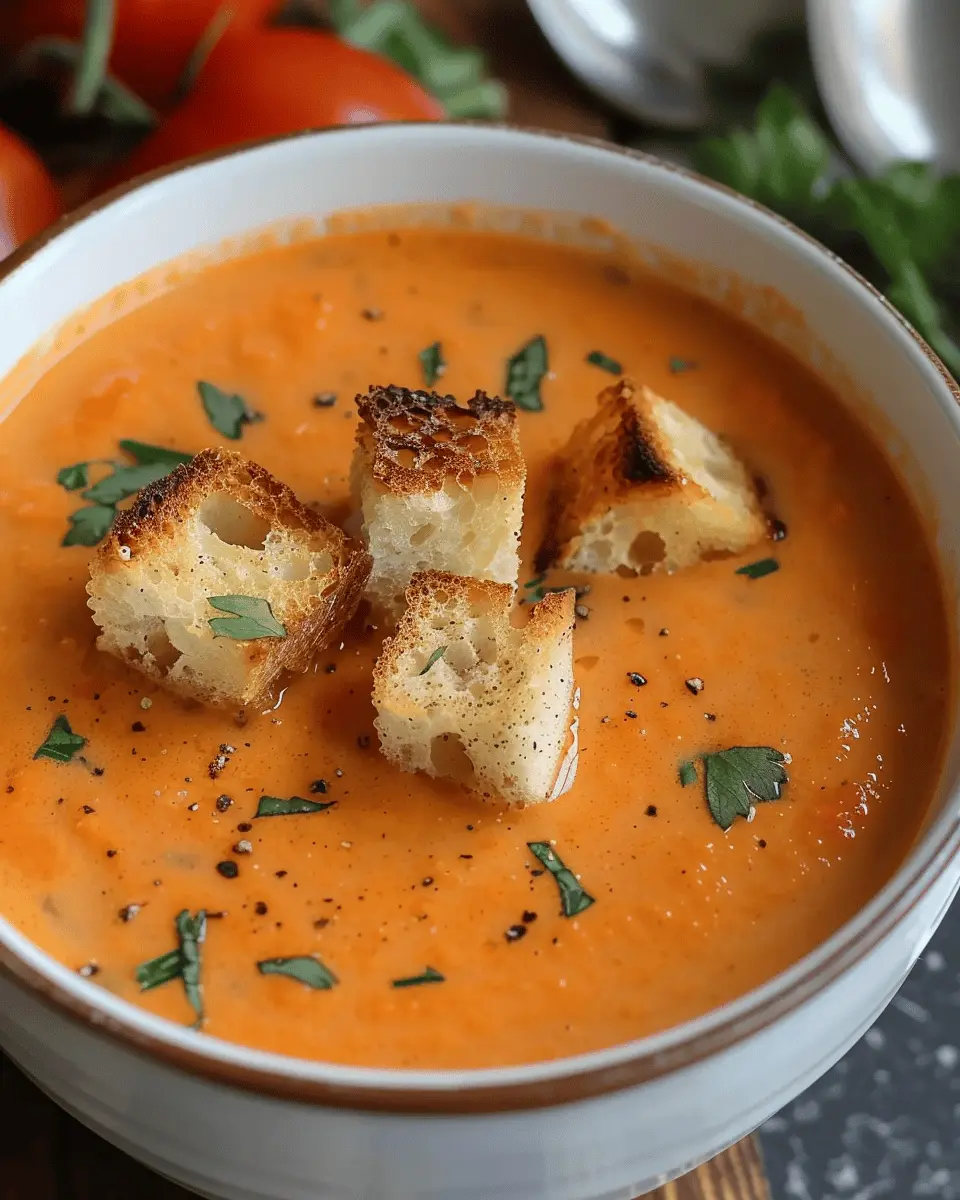 A sprinkle of fresh herbs not only enhances the flavor but also adds a pop of color. Serve your easy creamy tomato soup hot, paired with a crusty piece of bread or a grilled cheese sandwich. Both are classic accompaniments that complement the soup’s rich texture beautifully.