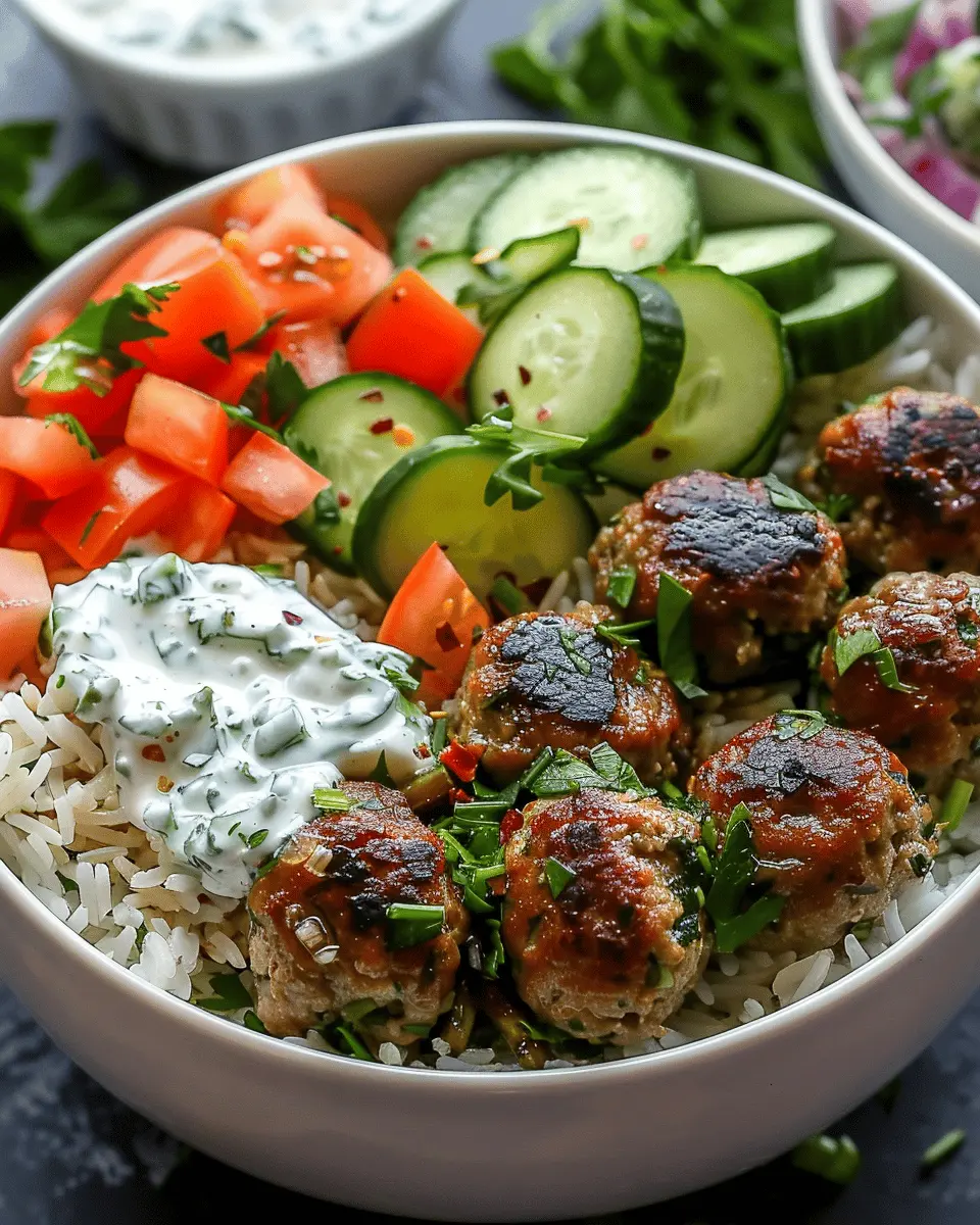 Balance of Flavors: The combination of savory meatballs, creamy tzatziki, and a crunch of fresh veggies offers a dynamic flavor profile that keeps your palate interested. This bowl serves up a perfect balance—each bite is like a little hug for your stomach.
