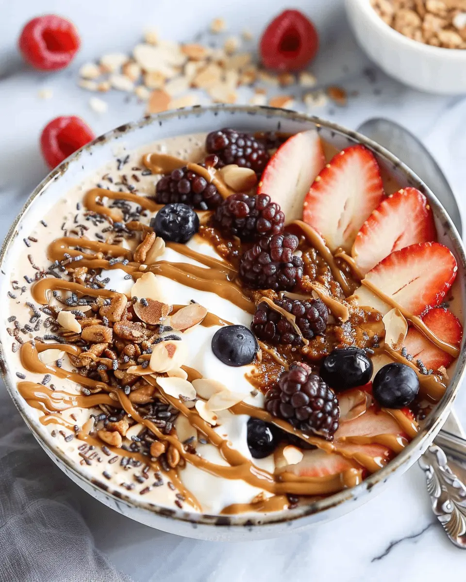 A delicious and nutritious breakfast option combining creamy Greek yogurt with almond butter and your favorite toppings.
