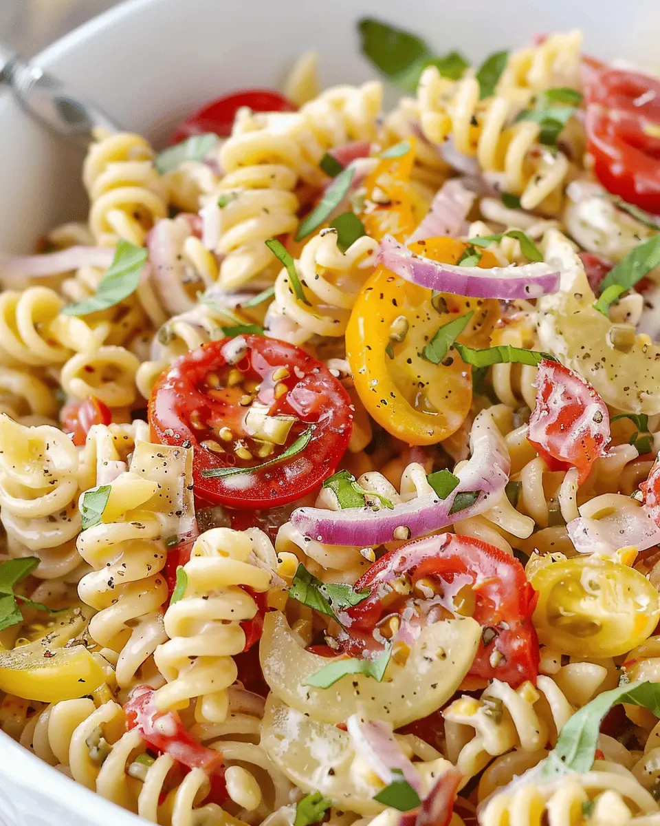 5. Pour the dressing over the pasta salad and mix until well combined.
