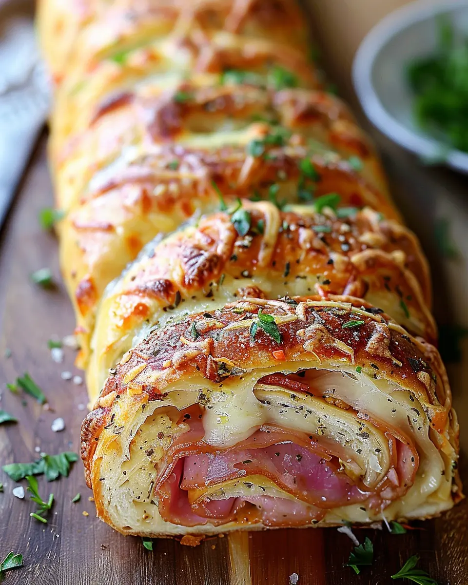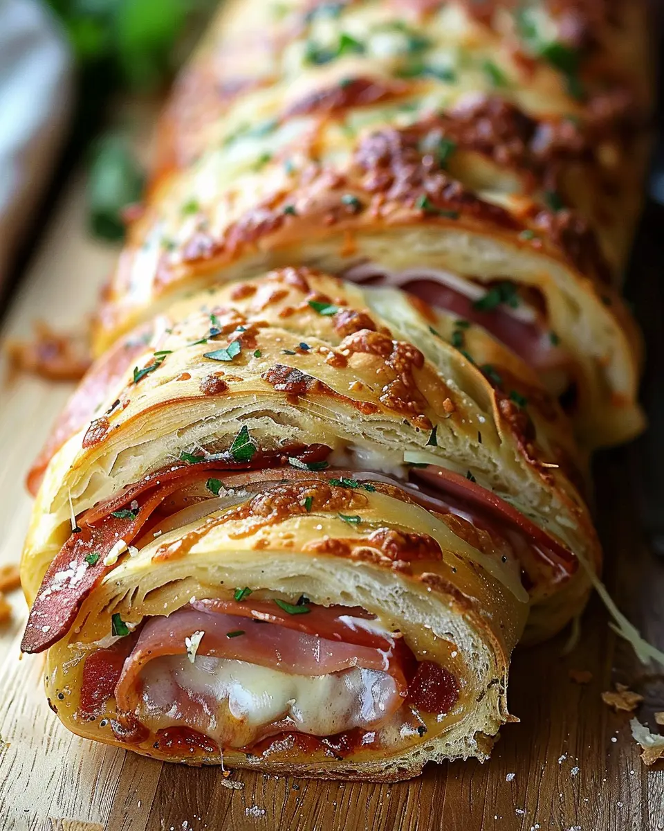 PrintItalian Stromboli Stuffed Bread: Easy Recipe with Turkey Bacon and Chicken Ham