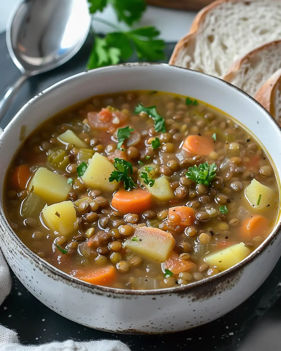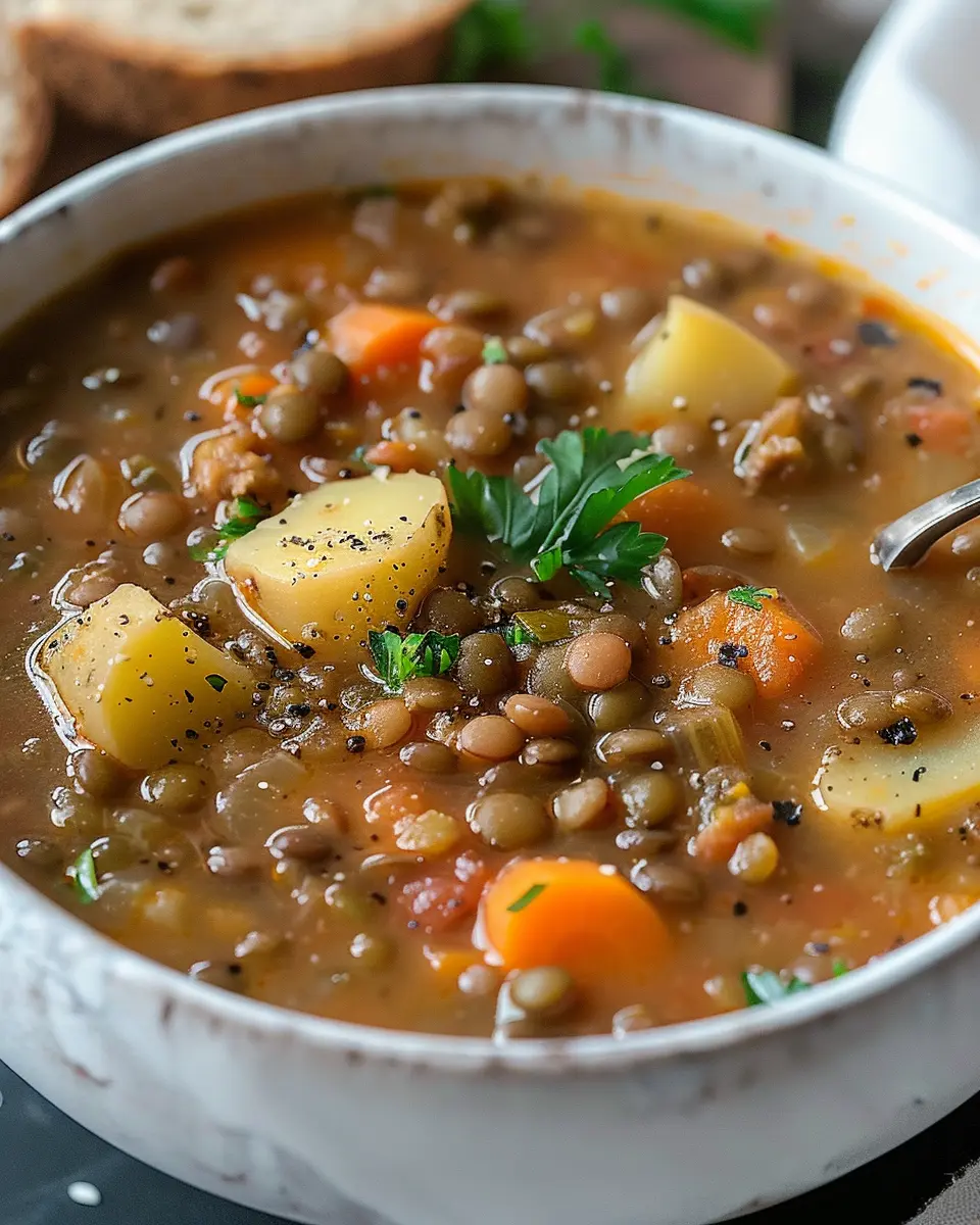 A hearty and comforting lentil potato soup enriched with the goodness of turkey bacon.