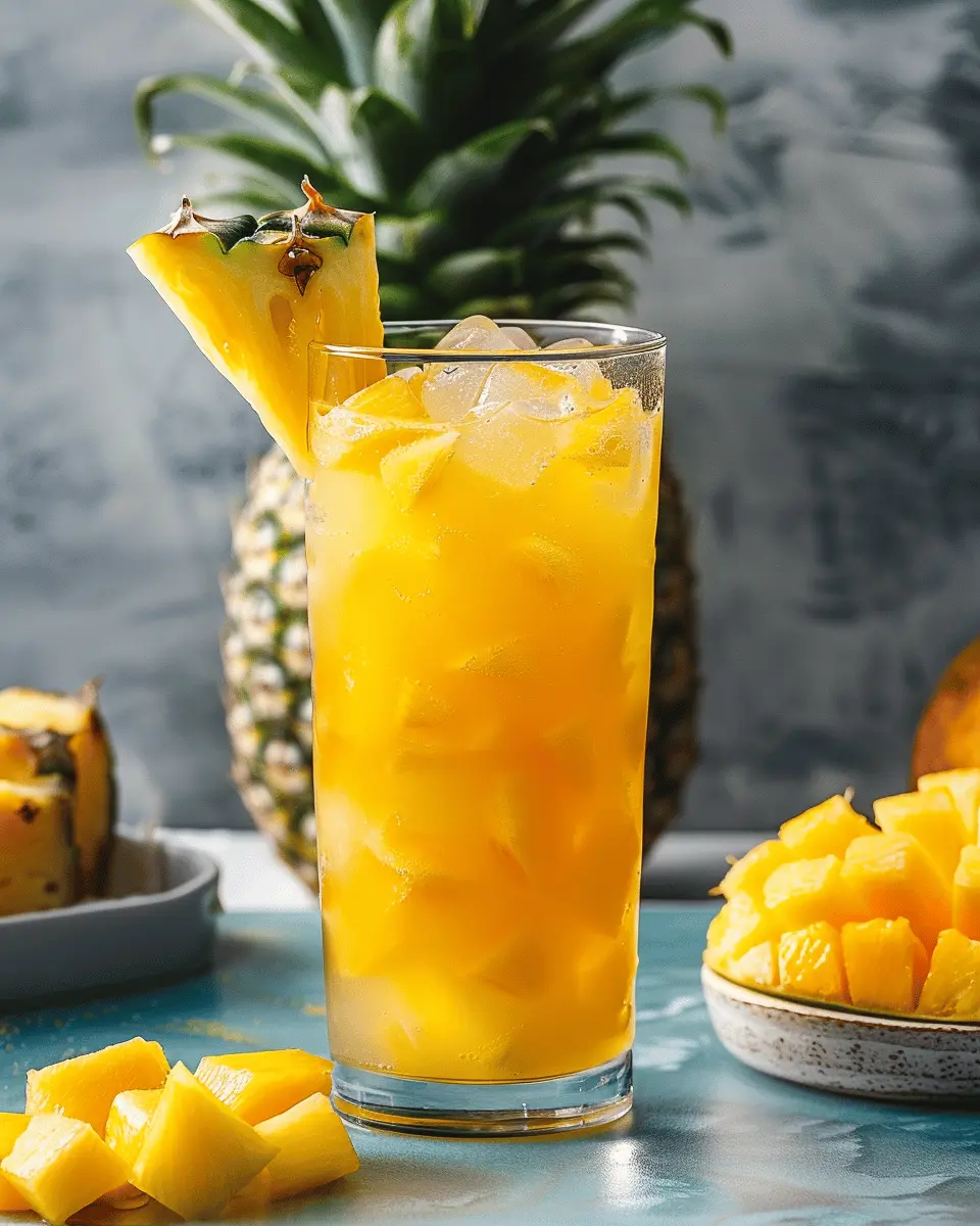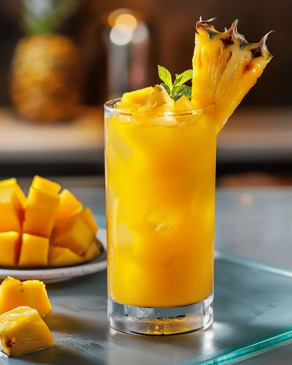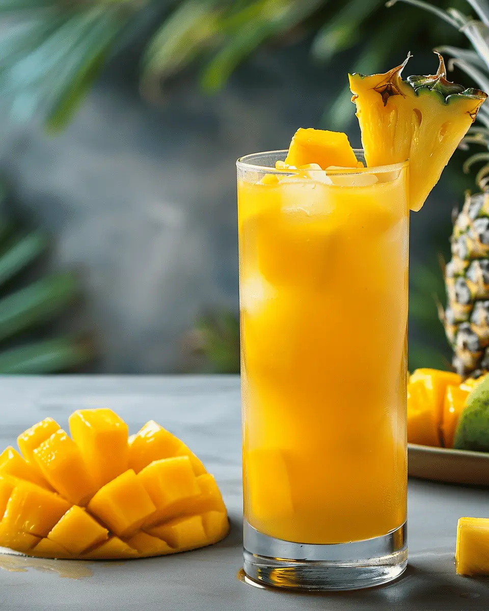 A delicious and refreshing drink perfect for hot summer days made with vibrant mangoes and pineapples.