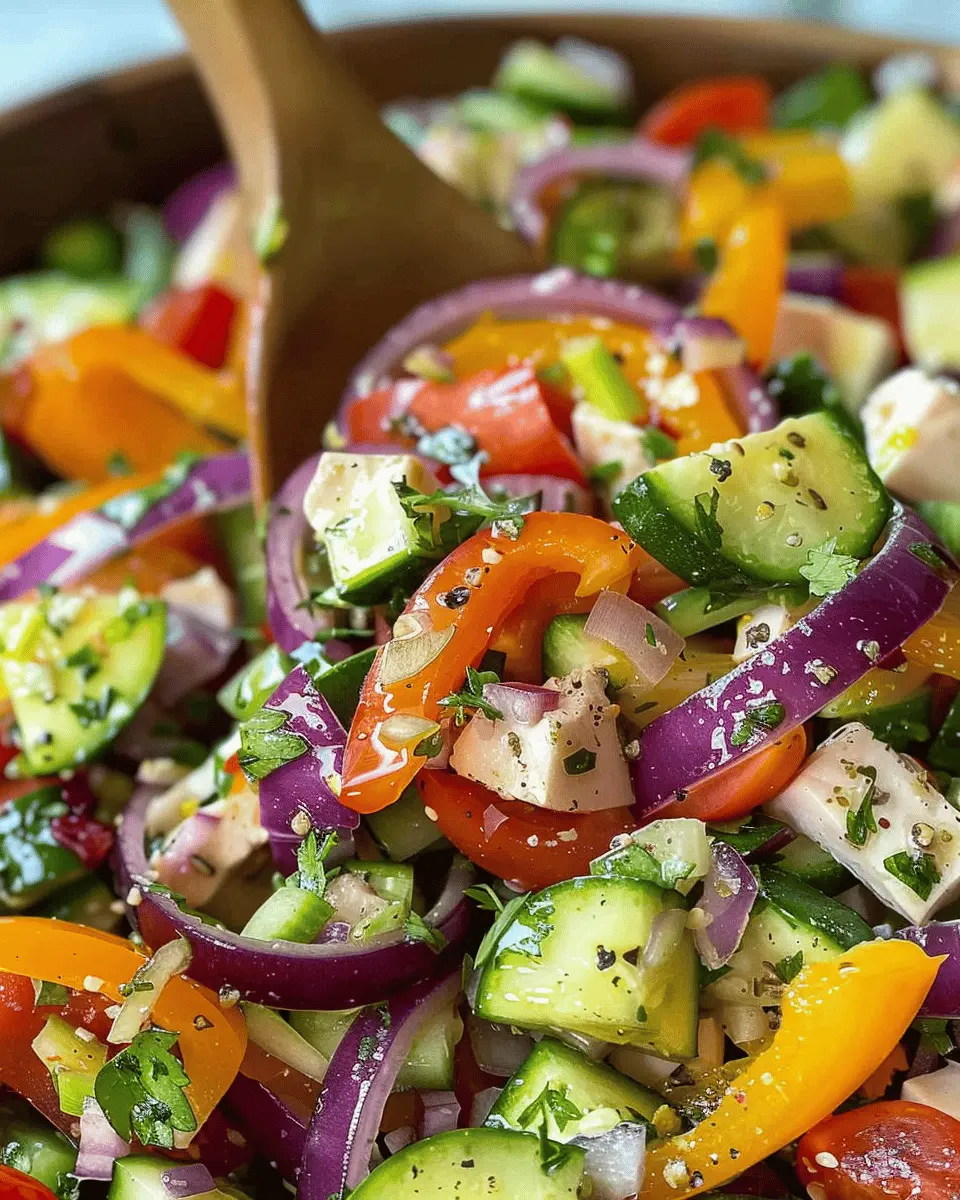 Now for the fun part—combining your marinated vegetable salad! In a large mixing bowl, combine all your chopped vegetables. Pour over the dressing and toss everything gently to coat the veggies evenly. Don’t rush through this process; ensure every piece is well-loved by the dressing!