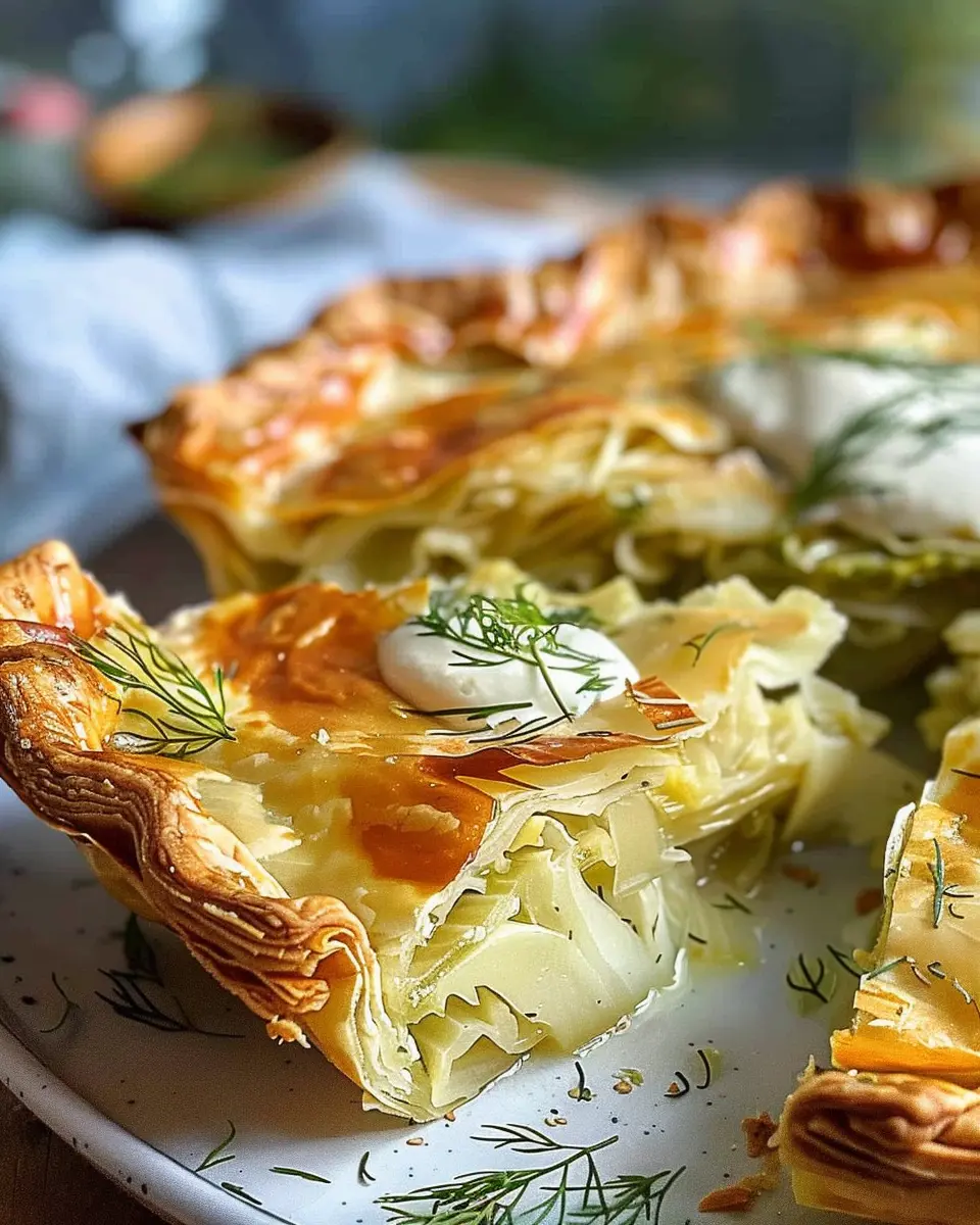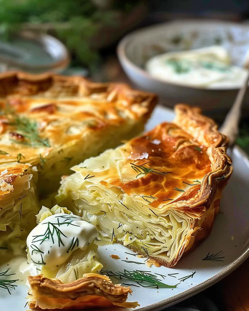 Keywords: Cabbage Pie, Dill Cream Sauce, Crispy Pie, Vegetarian Recipe