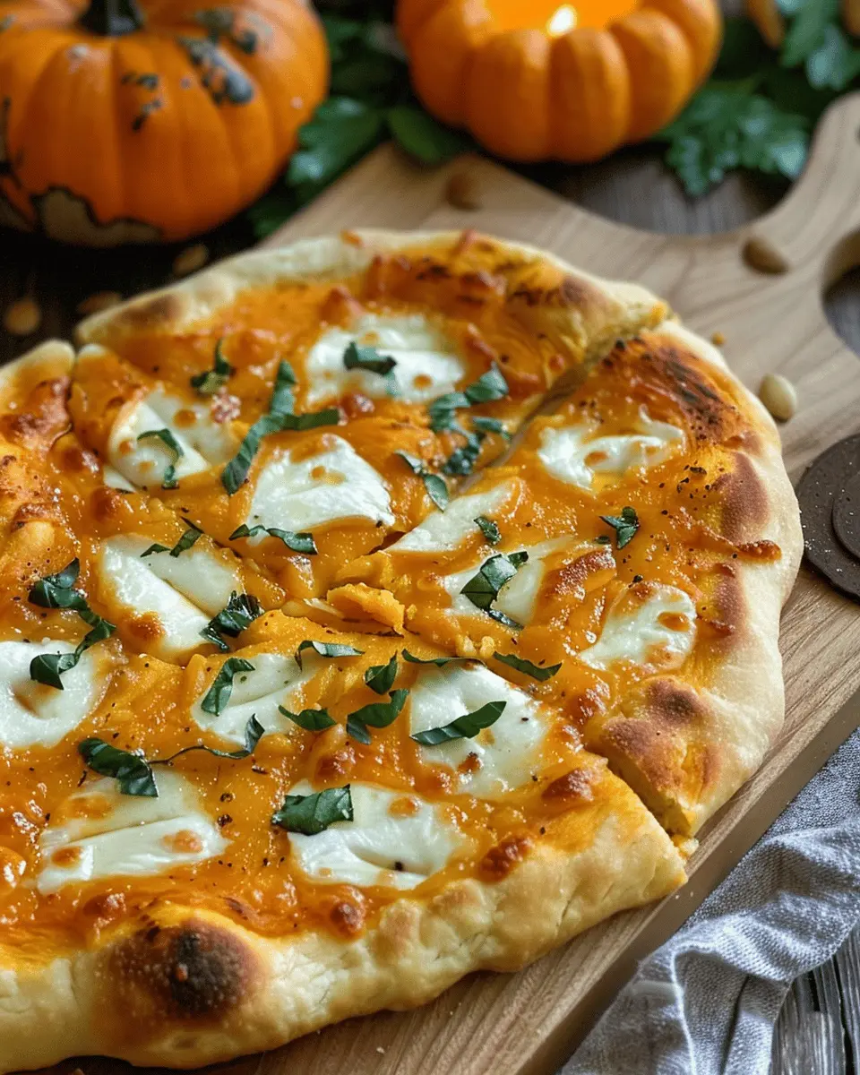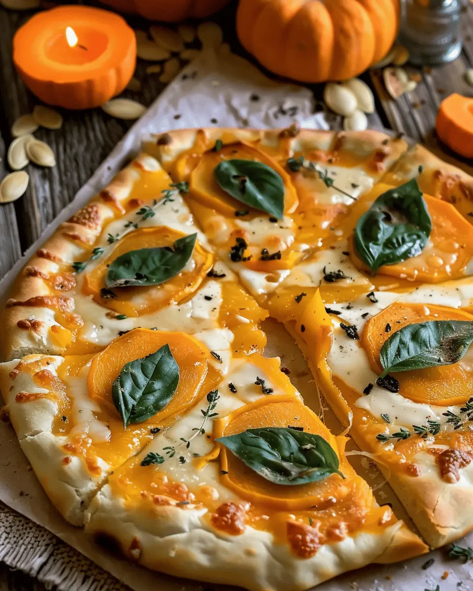 A creamy, savory flatbread topped with the rich flavors of pumpkin and cheese, perfect for any occasion.