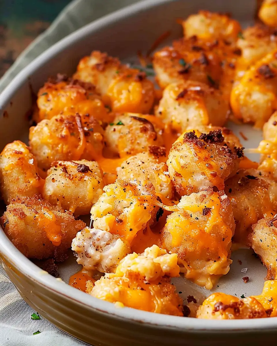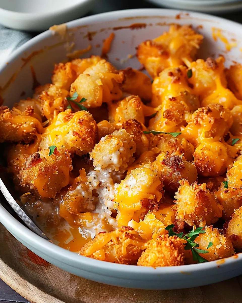 The best comfort food made with crispy tater tots, savory turkey bacon, and succulent chicken ham.