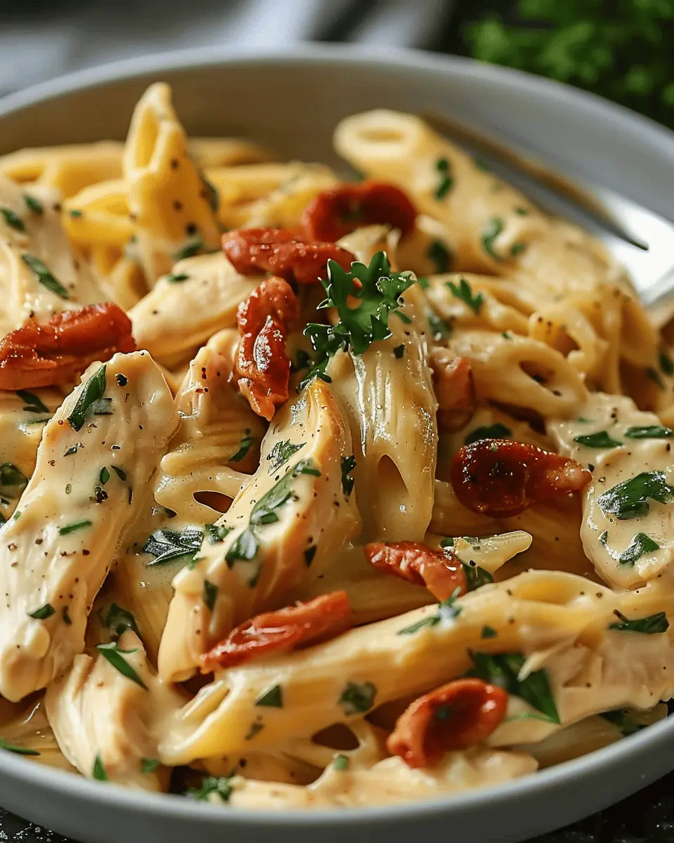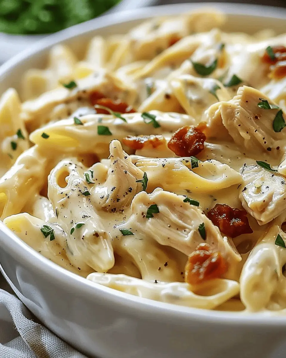 A deliciously rich and creamy chicken pasta dish featuring turkey bacon for an added delight.