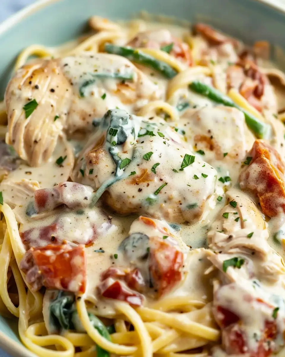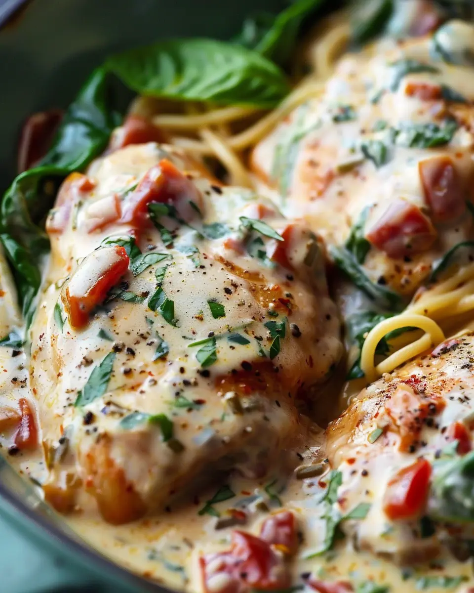 A rich and creamy slow cooker dish that combines tender chicken with vibrant Tuscan flavors.