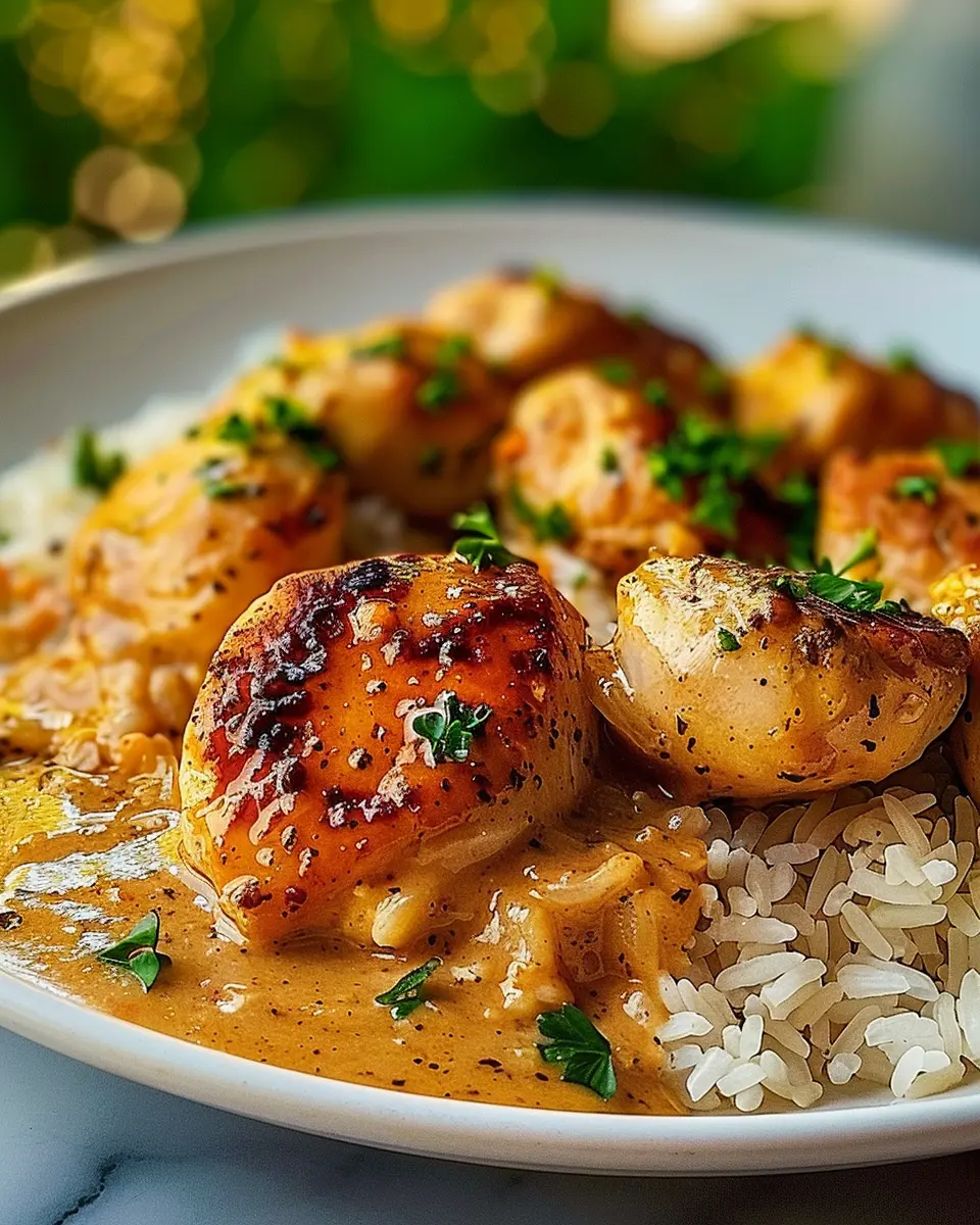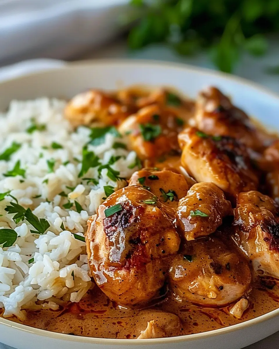 At last, it’s time to plate your masterpiece! Serve a generous scoop of the fluffy rice on each plate, topping it with a piece of the succulent chicken and an ample ladle of that dreamy sauce. Don’t forget to garnish with fresh herbs like parsley or cilantro for a pop of color and freshness! It’s a dish that not only warms your belly but also your heart.