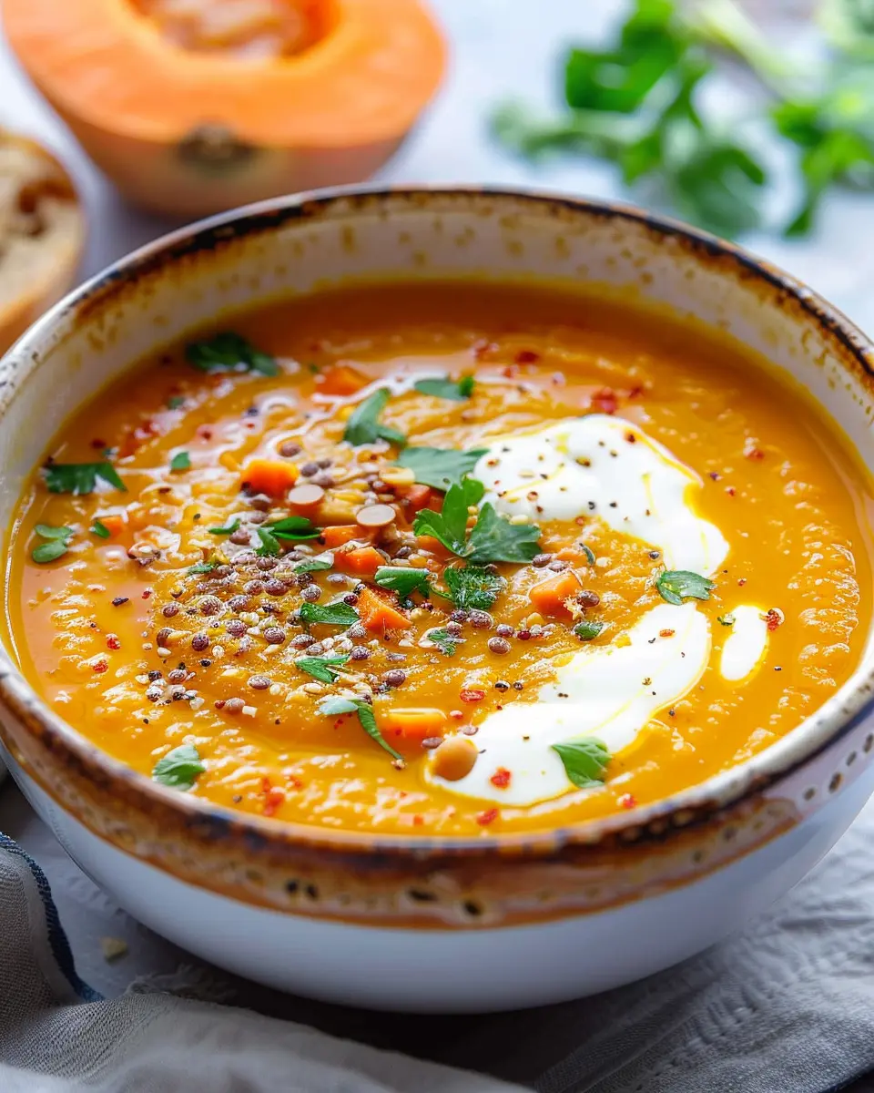 Enjoy a warm bowl of spiced carrot and lentil soup, perfect for chilly days.