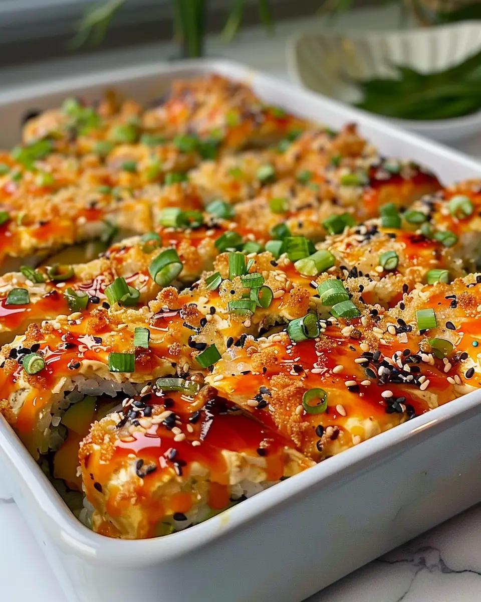 A great sushi bake includes a delightful mix of crab and a spicy sauce. This adds a creamy texture that balances the dish.